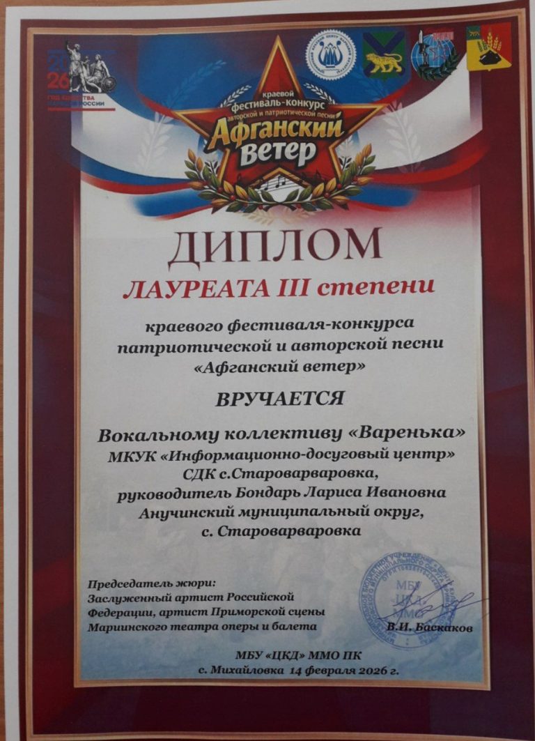 Краевой фестиваль-конкурс патриотической и авторской песни «Афганский ветер» прошёл 14 февраля в ДК с. Михайловка в преддверии Дня воина-интернационалиста. Наши участницы вернулись с достойной наградой!